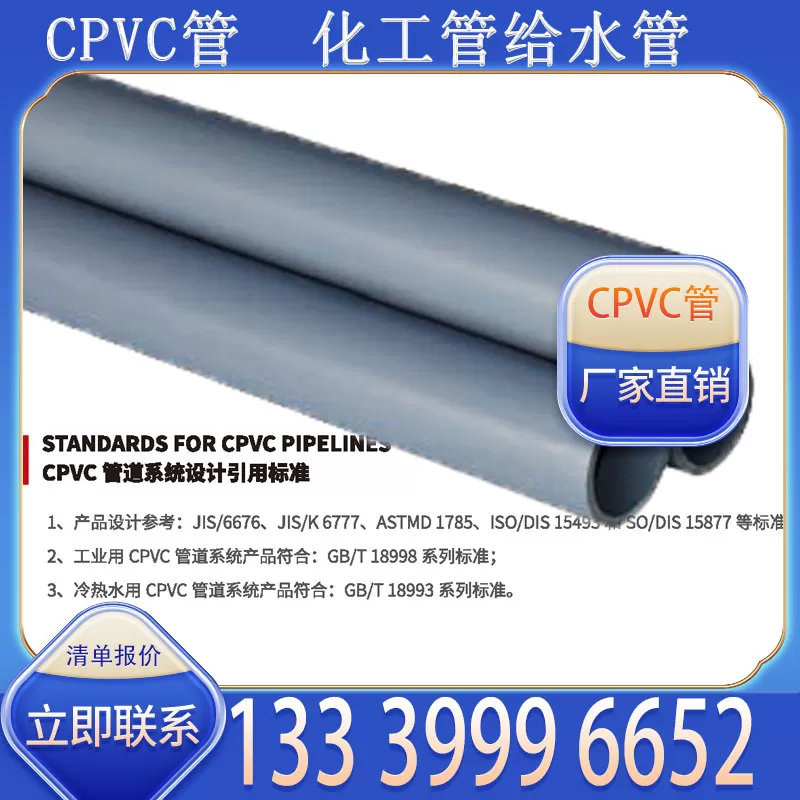 产品使用场景广泛,适用于化工行业低浓度酸碱溶液输送、制药行业腐蚀性原料传输、电镀行业废液排放、电子行业高纯试剂输送等,能适配室内设备管路或室外防腐管道安装。目前厂家支持批量批发,价格具备优势,有意采购 CPVC 化工管的客户,可直接拨打联系方式 13339996652 咨询详情。