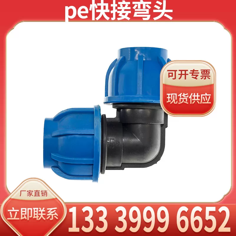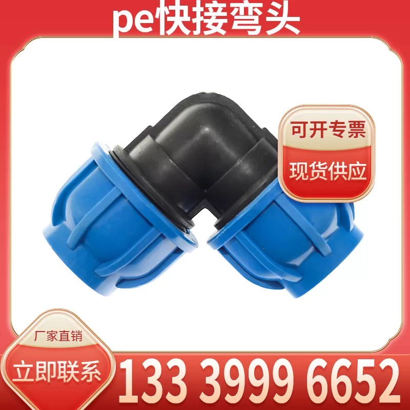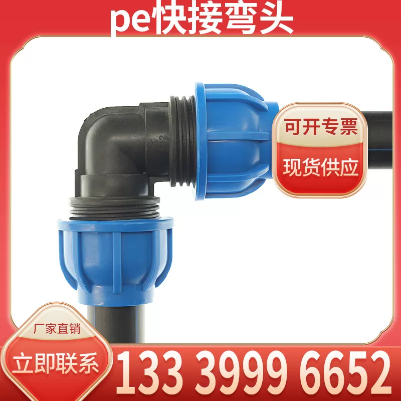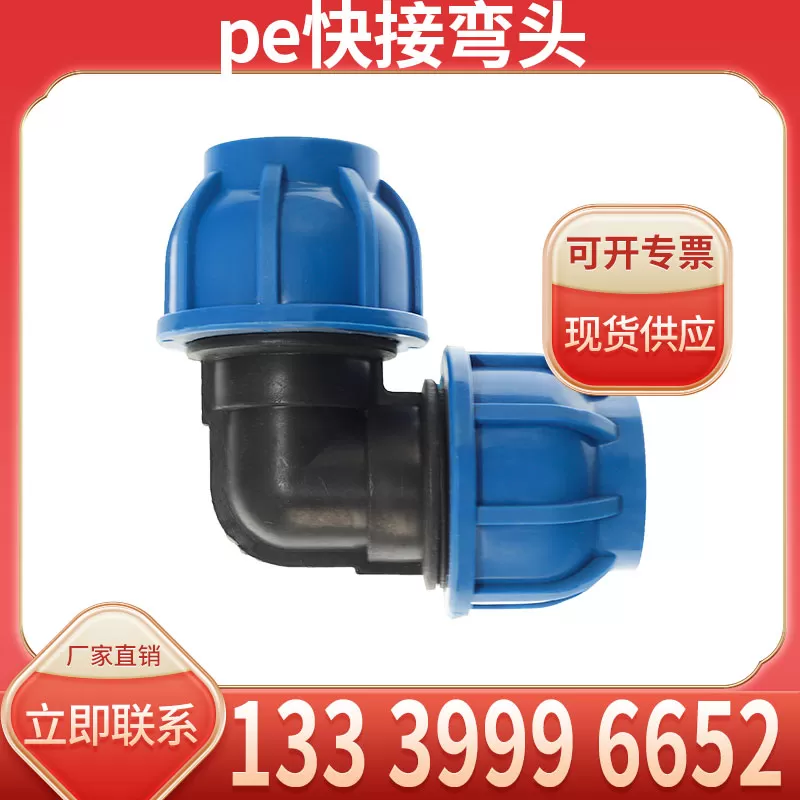 PE 快接弯头又称聚乙烯快接弯头,是 PE 材质的管道连接配件,采用快接式设计,用于管道转向处连接,适配多种 PE 管道系统,安装无需复杂工具,便捷高效。厂家直供,支持批发,咨询联系 13339996652。