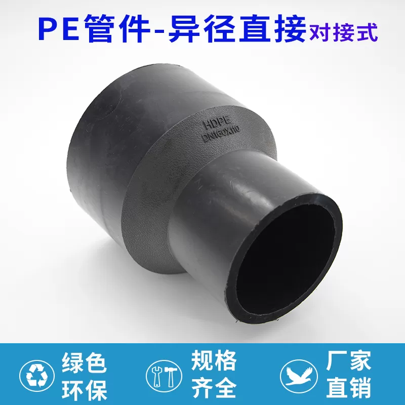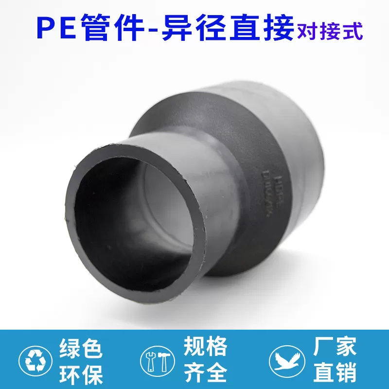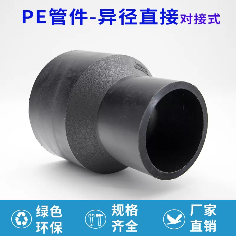 pe 异径直接对接式(又称 pe 对接式异径直接)是管道系统中实现不同管径管路直线连接的配件,采用 pe 材料加工而成,通过对接方式与管道连接,无需复杂操作,安装过程简便,能与同材质管道紧密结合,保障管路系统的稳定过渡。